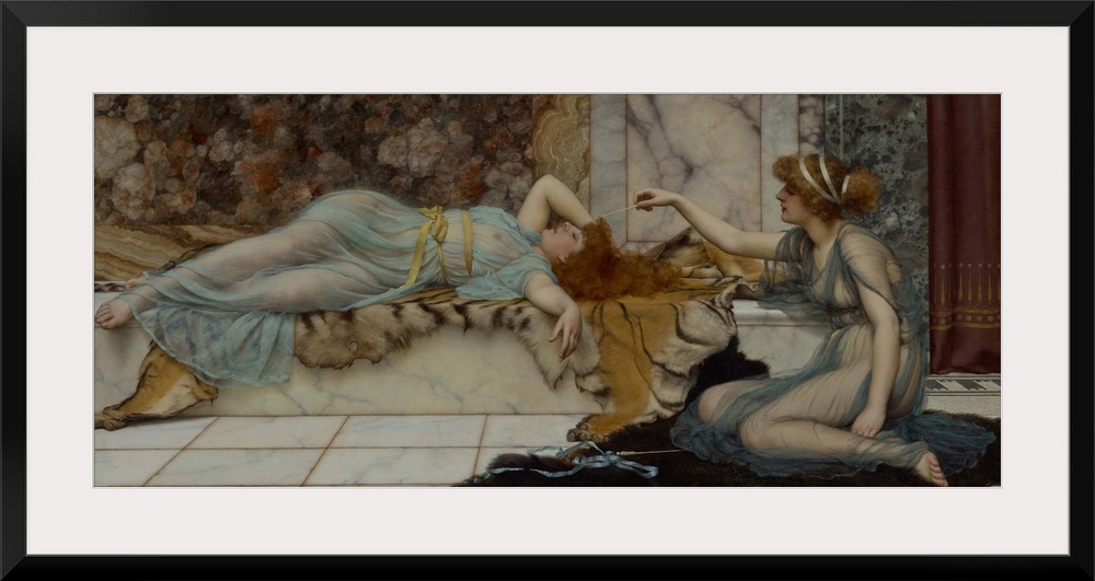 <p>Mischief and Repose, by John William Godward, 1895, English painting, oil on canvas. Godward was a virtuoso painter of diaphanous drapery, contrasting textures of fur and marble, creating antique settings for beautiful young women</p>