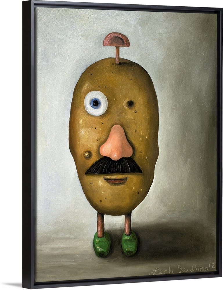 <p>Surrealist painting of a potato head toy with one eye missing and one ear on the top of the head.</p>