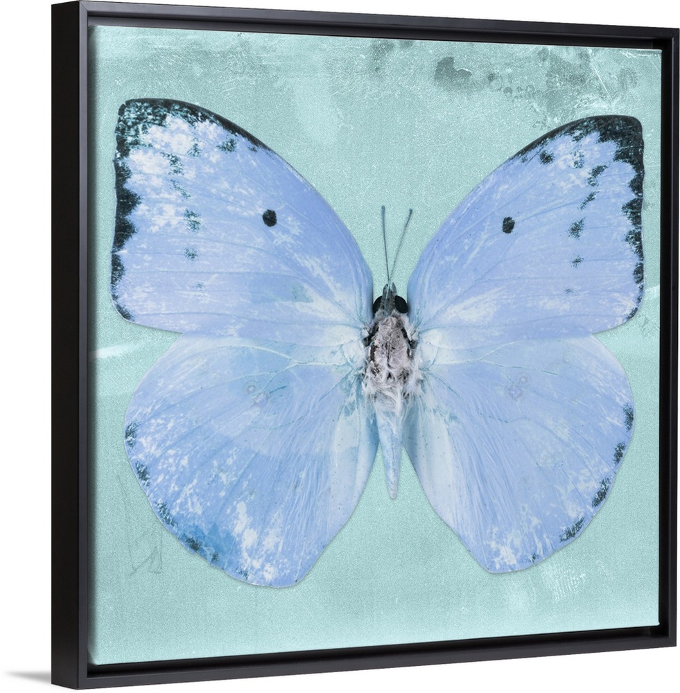 <p>Square photograph of a butterfly on a blue sparkly background.</p>