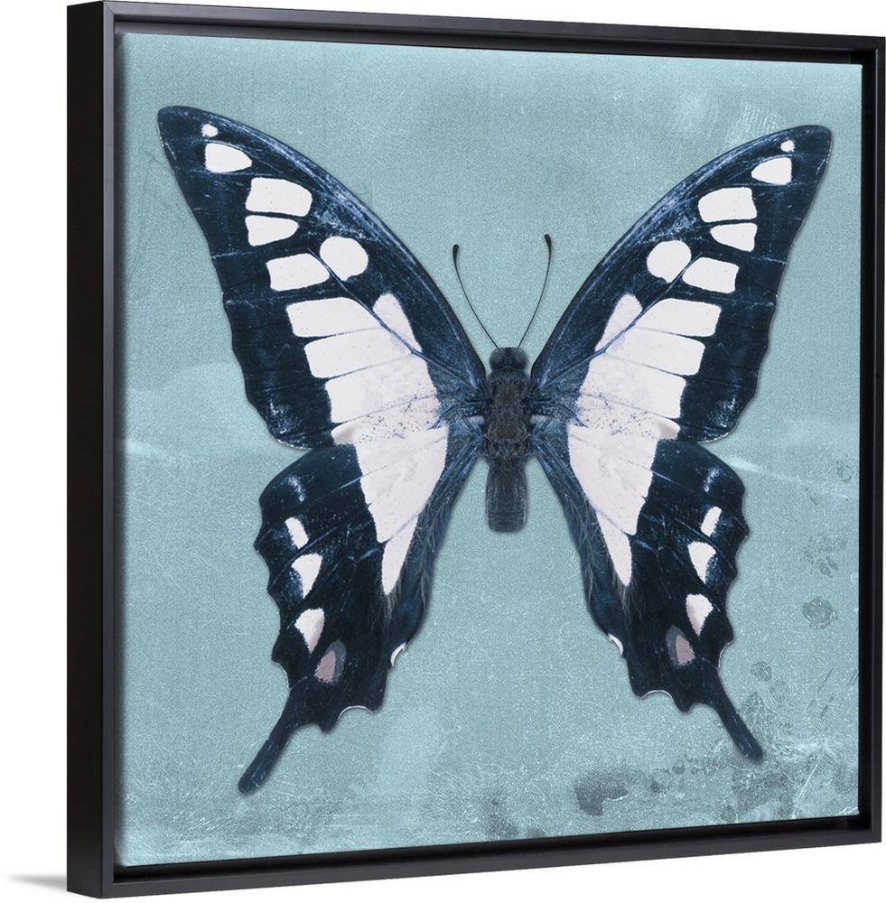 <p>Square photograph of a butterfly on a blue sparkly background.</p>