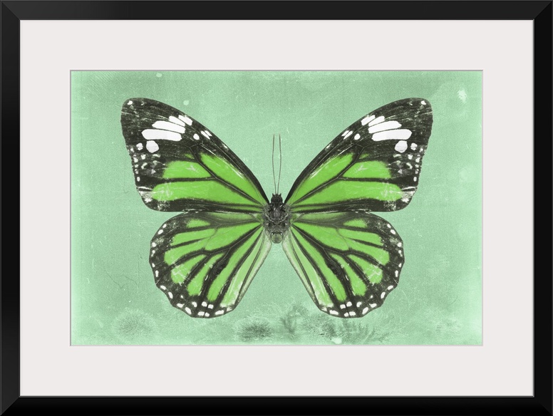 <p>Photograph of a butterfly on a green sparkly background.</p>