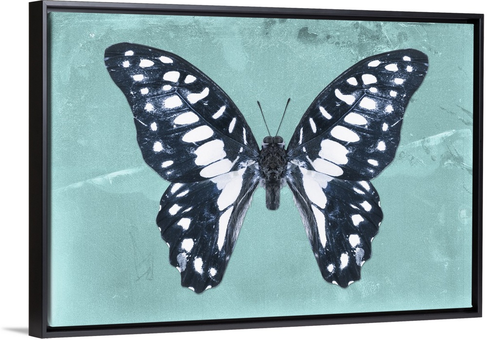 <p>Photograph of a butterfly on a blue-green sparkly background.</p>