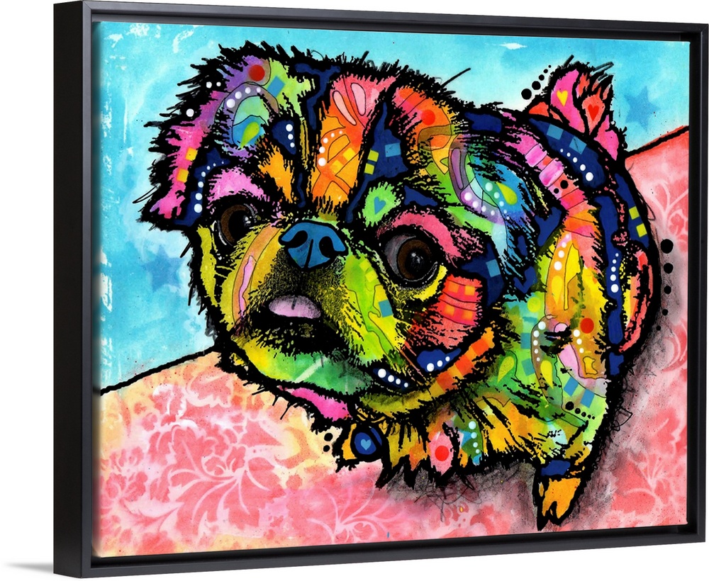 <p>Contemporary stencil painting of a pekingese puppy filled with various colors and patterns.</p>