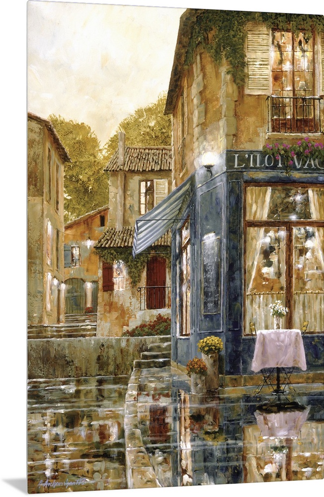 <p>Vertical artwork of a evening street scene in Europe of a single table outside of a restaurant with other shops nearby.</p>