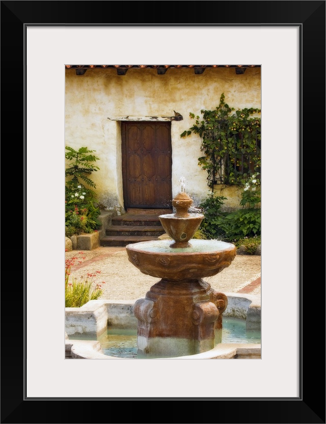 <p>Photograph taken of a fountain sitting in front of a home with steps leading up to a wooden door. Foliage sits to either side of the door.</p>