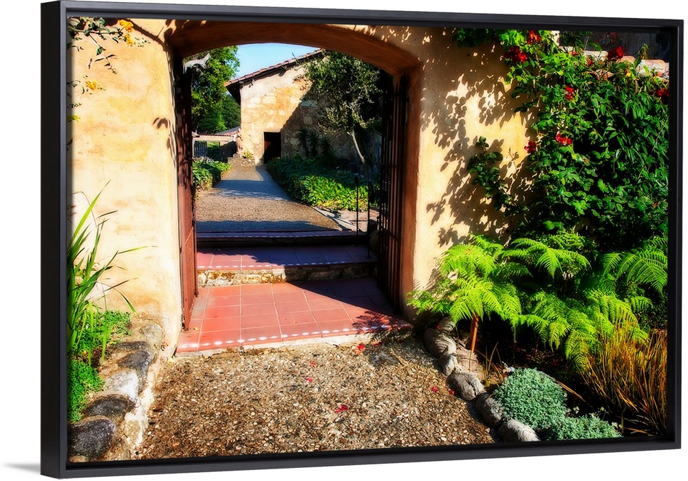 <p>Landscape photograph of a pathway through an arch lined with greenery in Carmel, California.</p>