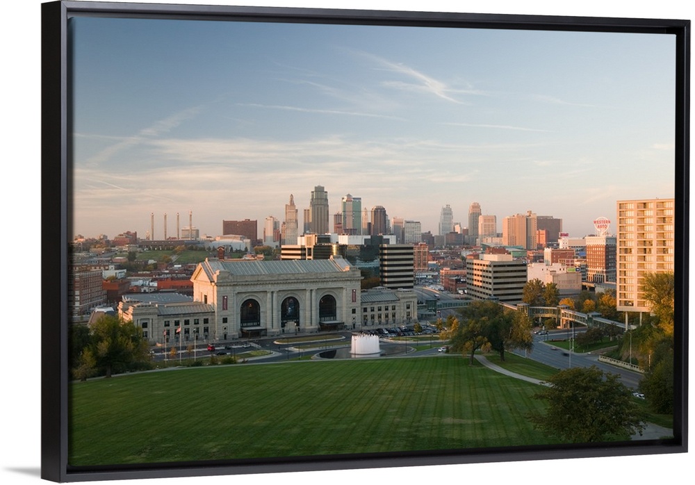 <p>Missouri, Kansas City. Union Station (b.1914) and Kansas City Skyline at sunset.</p>