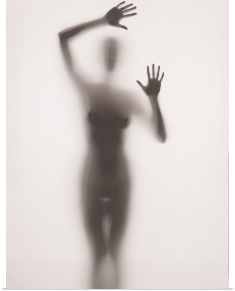 <p>Fine art photograph of nude female figure behind frosted glass.</p>