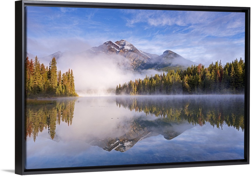 <p>Mist obscures Pyramid Mountain, reflected in Pyramid Lake in the Canadian Rockies, Jasper National Park, Alberta, Canada. Autumn, September, 2015.</p>
