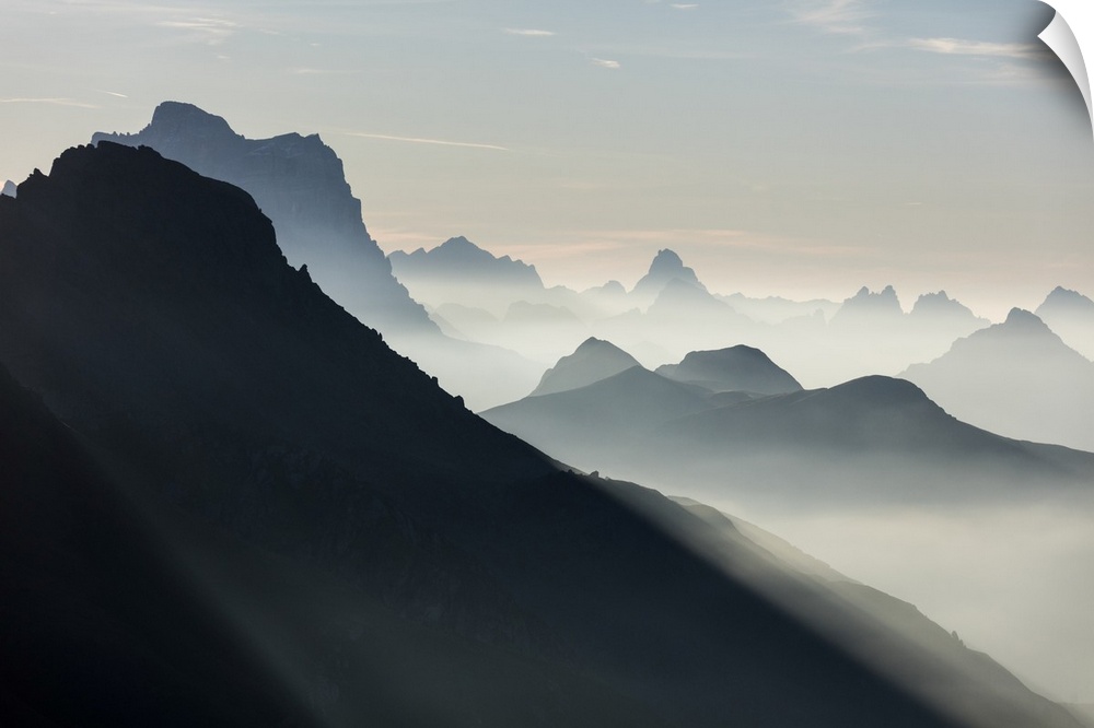 <p>Mist on peaks of Dolomites and Monte Pelmo seen from Cima Belvedere at dawn, Val di Fassa, Trentino-Alto Adige, Italy, Europe</p>
