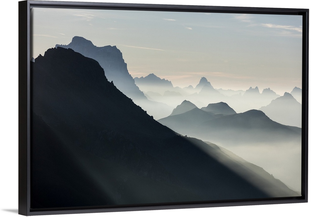 <p>Mist on peaks of Dolomites and Monte Pelmo seen from Cima Belvedere at dawn, Val di Fassa, Trentino-Alto Adige, Italy, Europe</p>