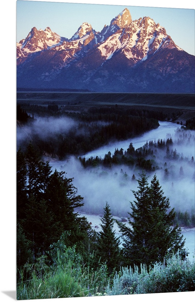 <p>Huge photograph displays an aerial view of a fog spreading over top of a dense forest and river within the Western United States. A jagged snow-capped mountain range serves as the backdrop for this picture.</p>