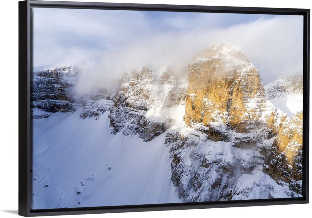 <p>Mist over the rocky peaks of Sella Group during a snowy winter, Gardena Pass, Dolomites, Trentino-Alto Adige, Italy, Europe</p>
