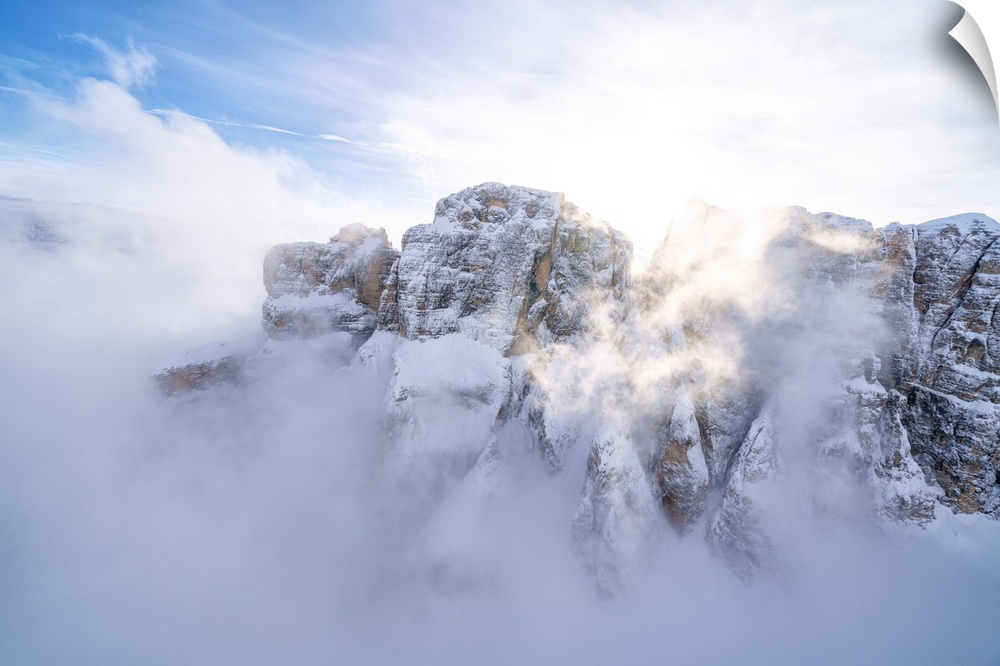 <p>Mist over the snowy peaks of Sella Group, Dolomites, South Tyrol, Italy, Europe</p>