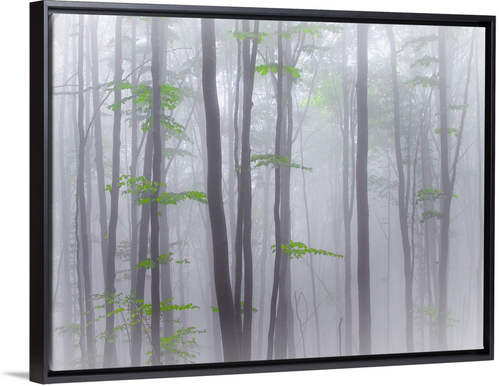 <p>A forest of thin trees in the fog with bright green leaves.</p>