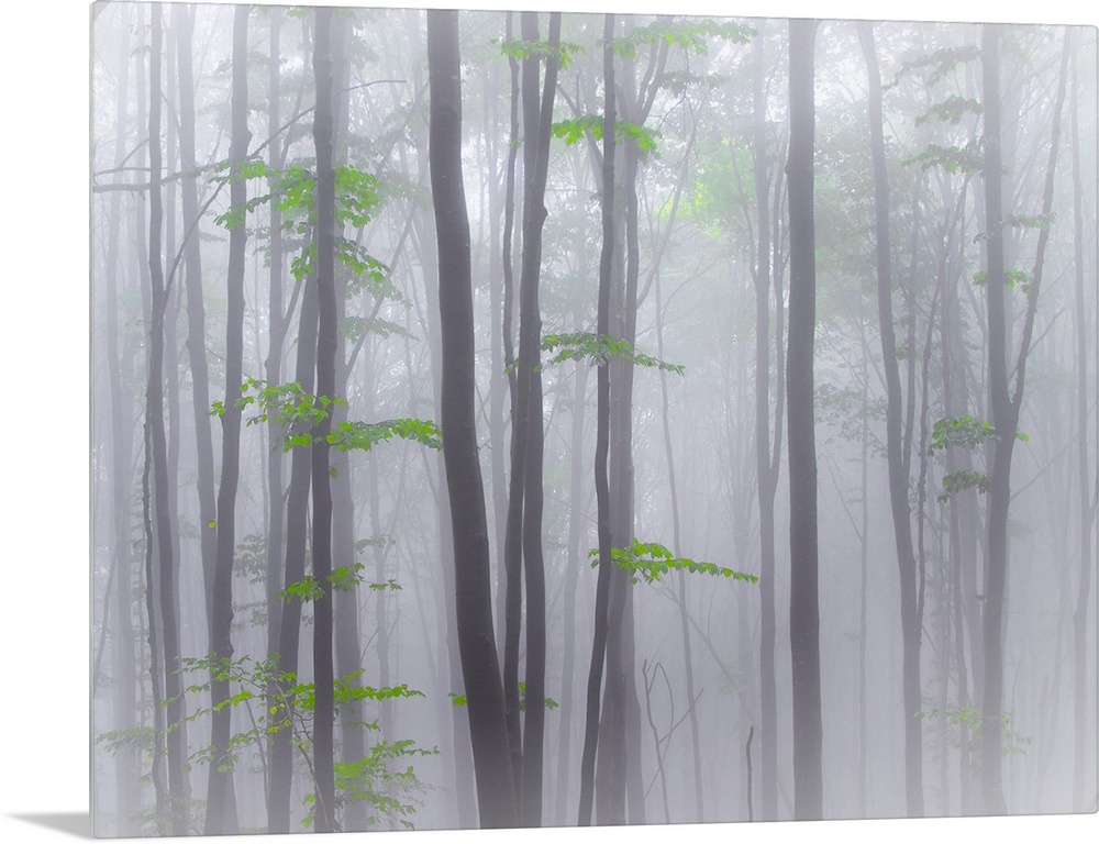 <p>A forest of thin trees in the fog with bright green leaves.</p>
