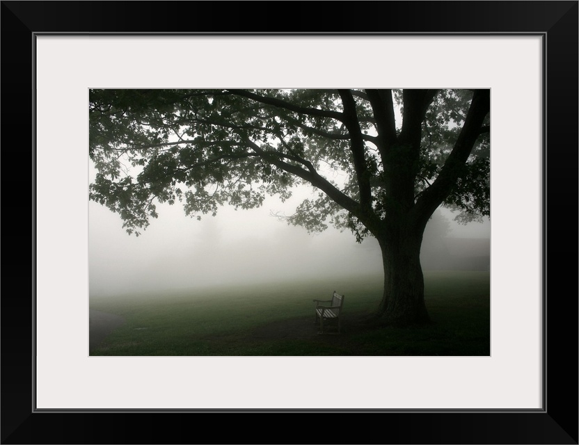 <p>A horizontal photograph of a bench under a tree in the mist.</p>