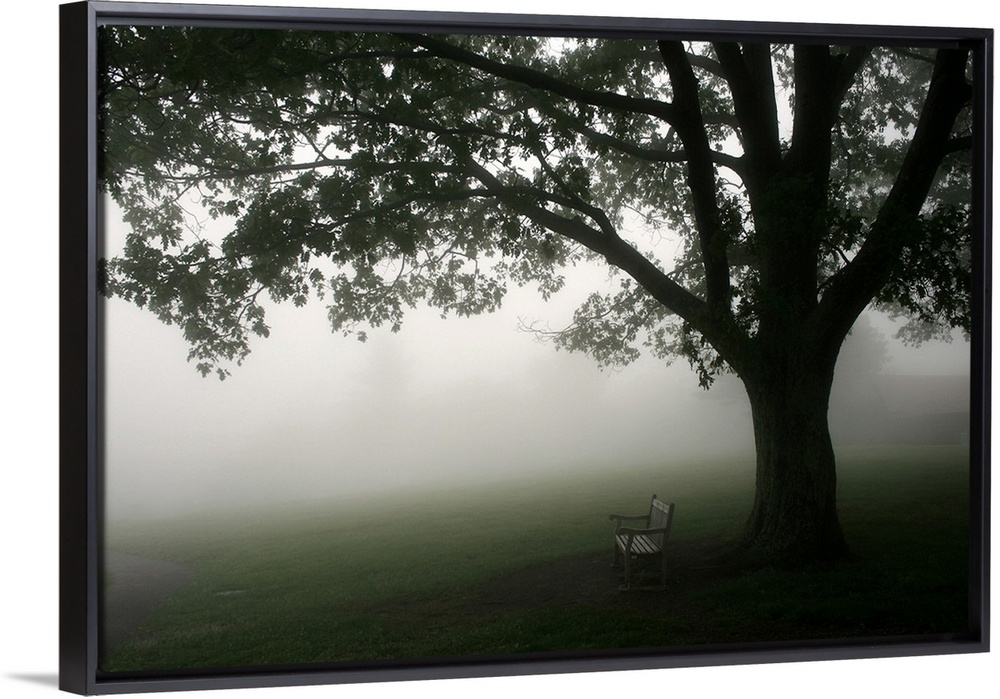 <p>A horizontal photograph of a bench under a tree in the mist.</p>