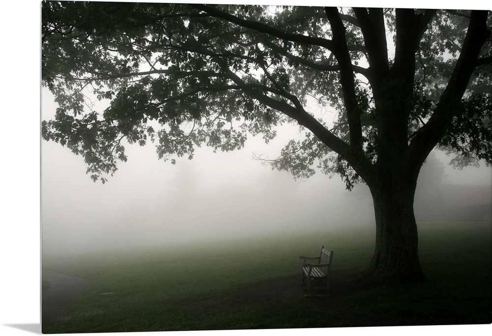 <p>A horizontal photograph of a bench under a tree in the mist.</p>