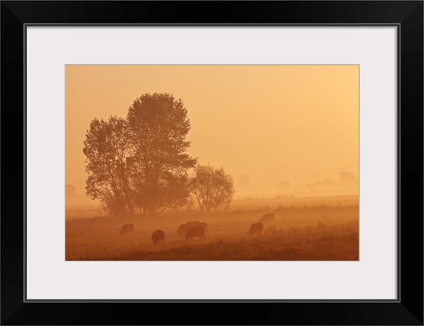 <p>Misty countryside glowing orange at sunrise with sheep (ovis aries) grazing in a pasture, in king's Sedgemoor, part of the somerset levels, near Langport, somerset, great britain, England.</p>