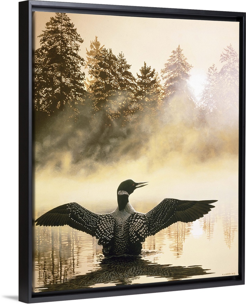 <p>A loon spreads its wings in the early morning.</p>