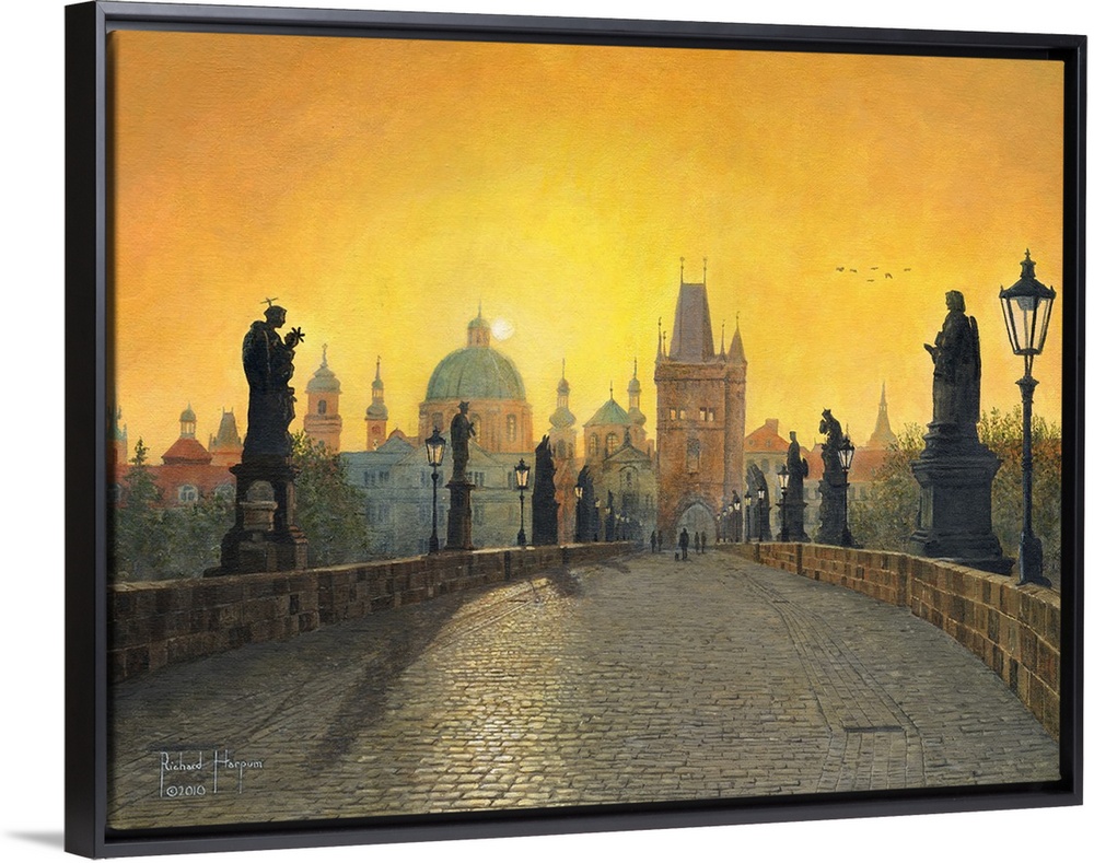 <p>Contemporary artwork of a view across a long old bridge lined with statues, toward a city filled with green domed building tops.</p>