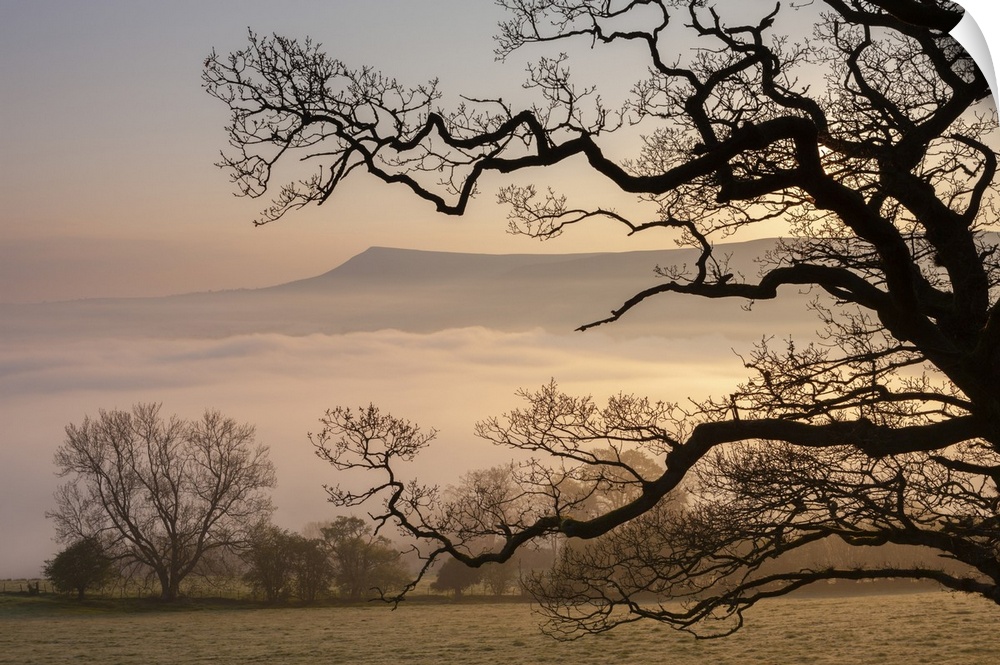 <p>Misty dawn looking towards Mynydd Llangorse in the Brecon Beacons National Park, Powys, Wales, UK.</p>