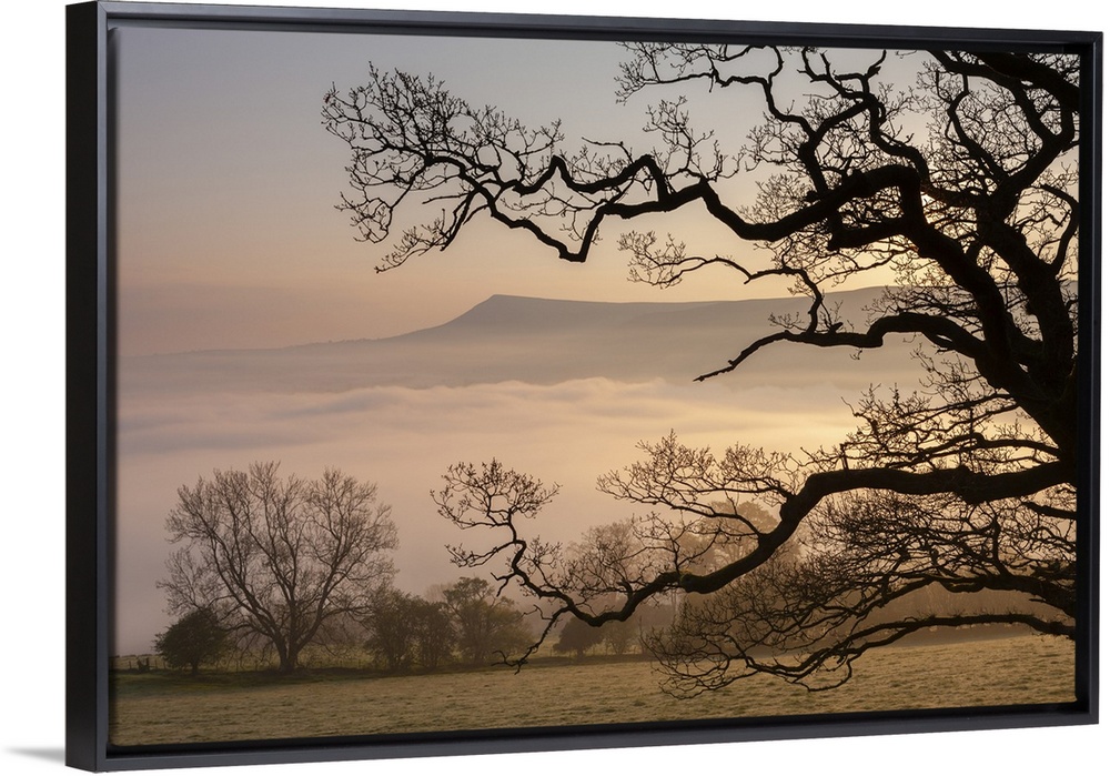<p>Misty dawn looking towards Mynydd Llangorse in the Brecon Beacons National Park, Powys, Wales, UK.</p>