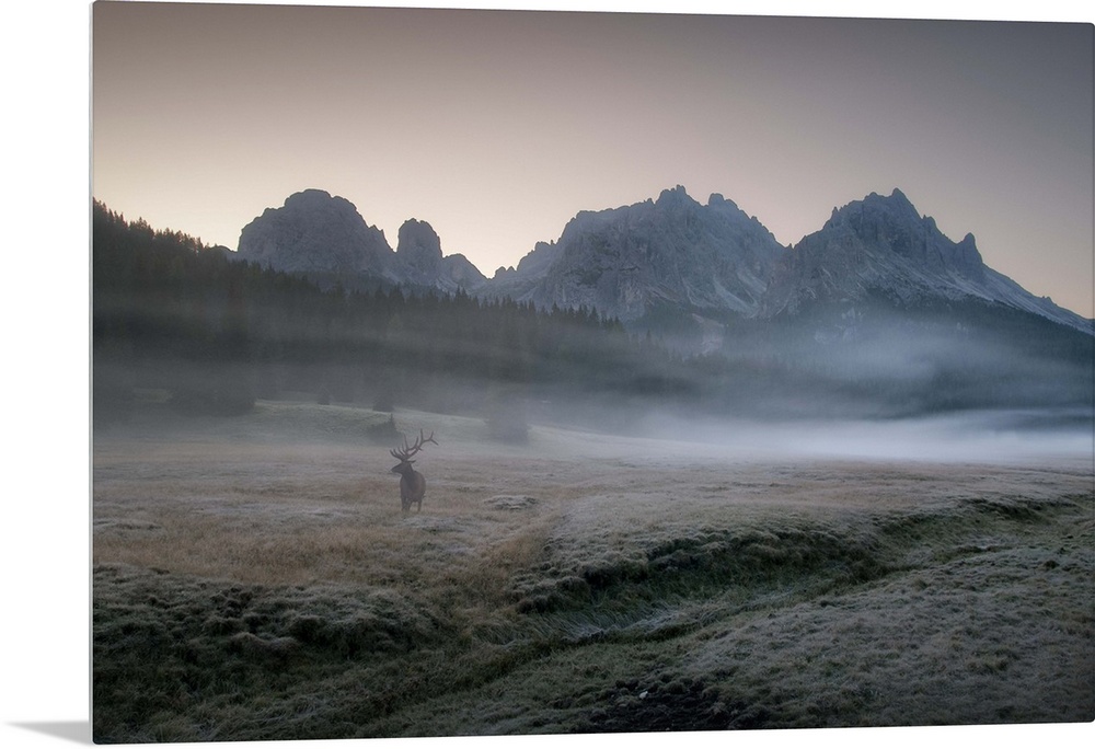 <p>An elk stands in a misty valley all alone in the morning, with towering mountains in the background.</p>