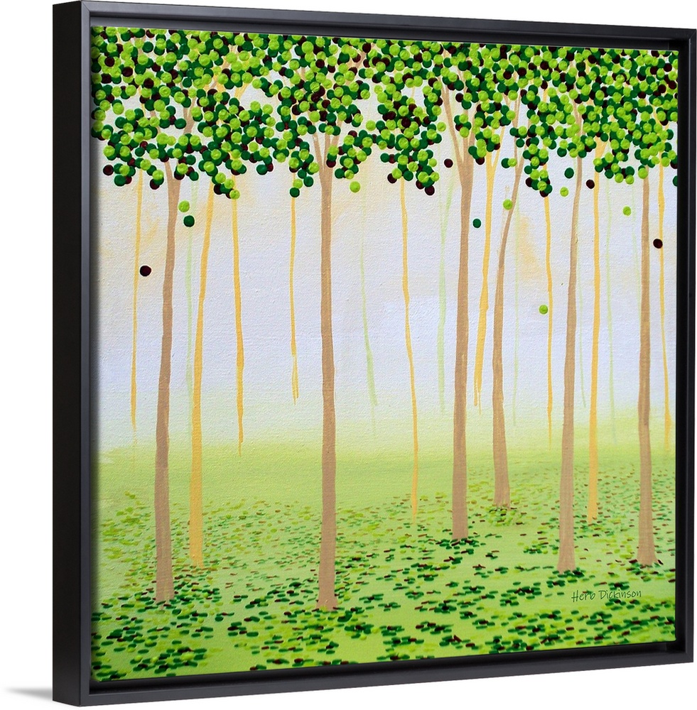 <p>Square painting of a forest covered in circular leaves made with shades of green.</p>