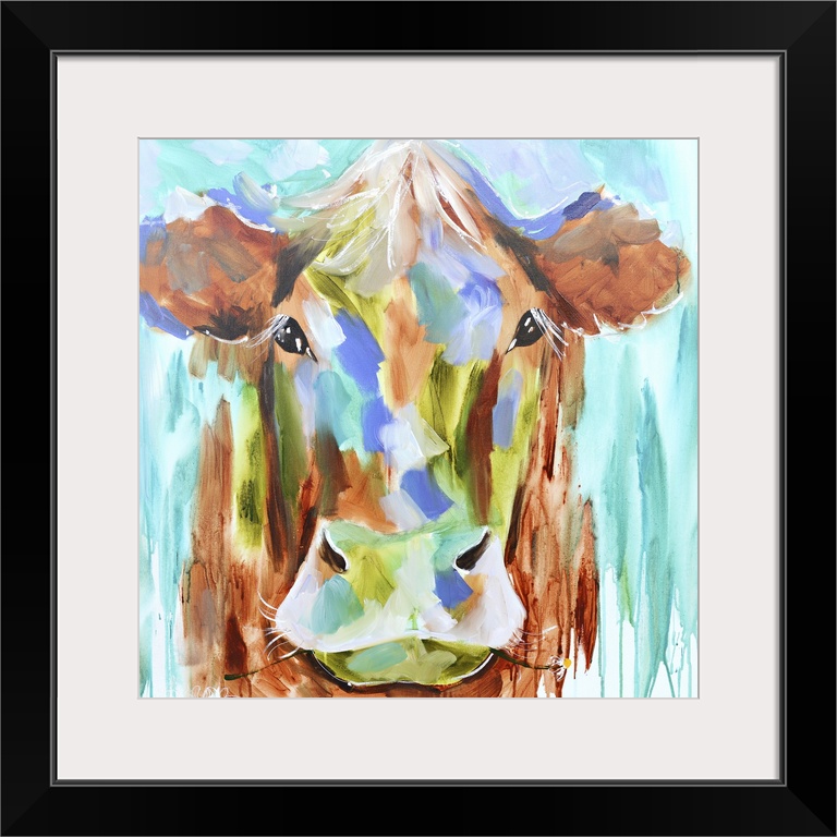 <p>A contemporary square painting of the face of a cow done in multiple colors with strokes of blue in the background.</p>