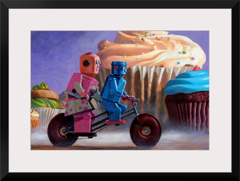 <p>A contemporary painting of a two retro toy robots riding a tandem bicycle with giant colorful cupcakes seen in the background.</p>