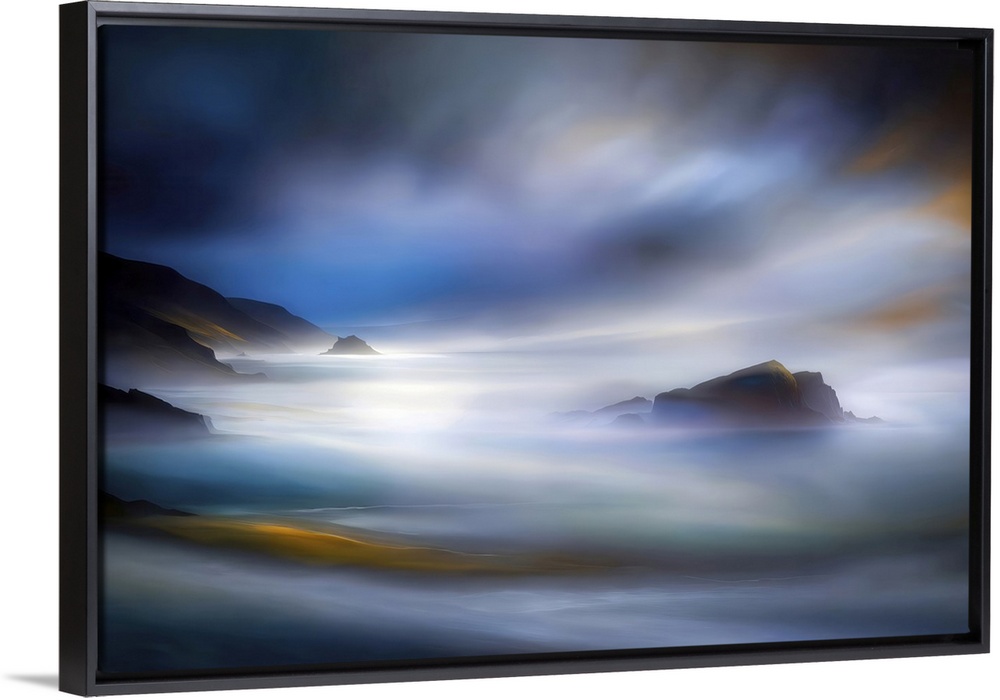 <p>A mystical seascape features misty waves flowing around rocky outcrops, under a dramatic sky with hues of blue and orange blending together. The scene conveys a sense of tranquility and ethereal beauty.</p>