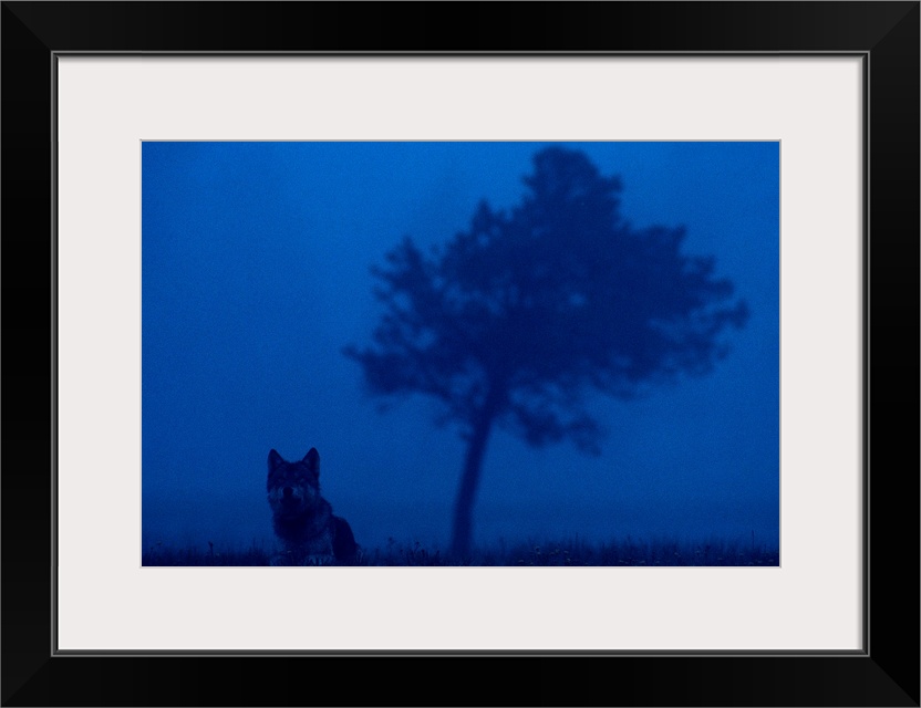<p>National Geographic photograph of a wild gray wolf in the dark mists at Yellowstone National Park in in Wyoming.</p>