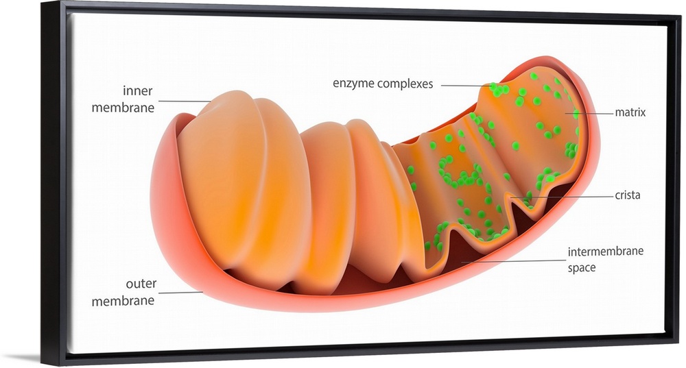 <p>Mitochondrion. Illustration of the internal structure of a mitochondrion, an organelle in eukaryotic cells that is the site of energy production. There are two membranes: an outer membrane (red) enclosing an inner membrane (orange) that forms folds (cristae). Cristae are the sites of aerobic cell respiration, where sugars and fats are oxidised to release energy. Enzyme complexes (green) are shown in the mitochondrial matrix. Between the two membranes is the intermembrane space. For this artwork without labels, see image C023/8748.</p>