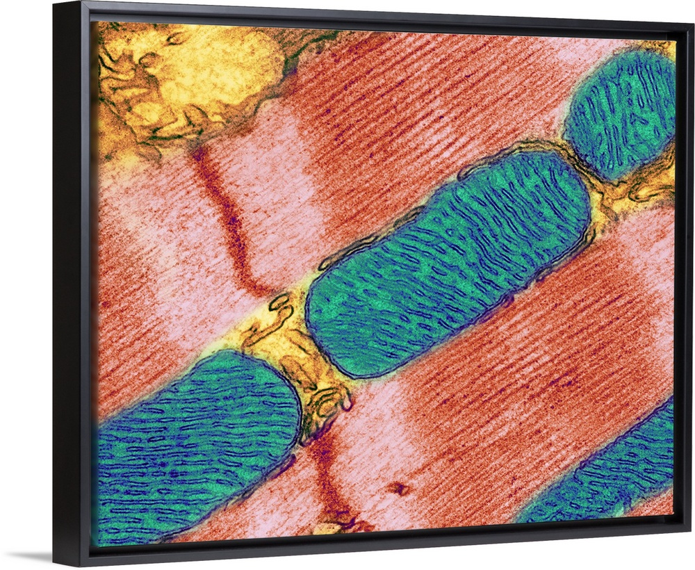 <p>Mitochondrion. Coloured transmission electron micrograph (TEM) of mitochondria (blue/green) in heart muscle. Mitochondria are organelles found in the cytoplasm of eukaryotic cells. They oxidise sugar and fats to produce energy. Mitochondria have two membranes (blue), a smooth outer membrane and a folded inner membrane. The folds of the inner membrane are called cristae, and it is here that the chemical reactions to produce energy take place. Magnification: 8000x when printed 10 centimetres tall.</p>
