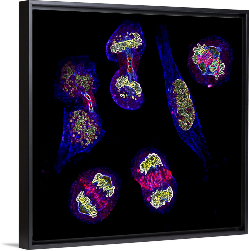 <p>Mitosis. Fluorescence micrograph of six cells at different stages of mitosis (nuclear division). Mitosis is the formation of two daughter nuclei from one parent nucleus. During mitosis the chromosomes (white and yellow), which contain two identical chromatids, are separated and divided equally between the cells. This occurs when microtubules (blue) attach to the chromosomes and then contract pulling them apart. The cell organelles and cytoplasm are also shared. The cells are then separated by cytoplasmic cleavage. Clockwise from top right the stages shown are; metaphase, interphase, late anaphase, early anaphase, cytokinesis and telophase.</p>