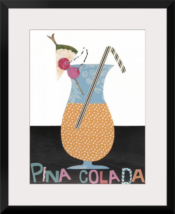 <p>This decorative artwork has double meaning by featuring mixed drinks created with mixed media components. Cut pieces of patterned paper are layered over a painted background.</p>