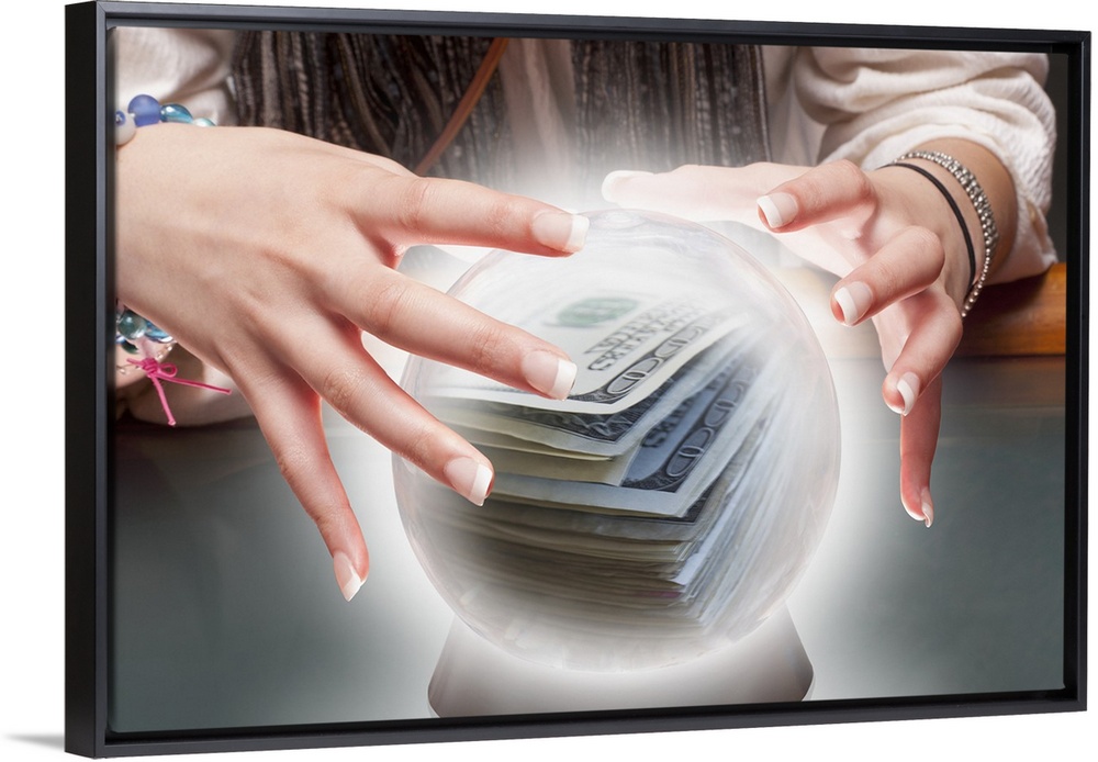 <p>Mixed race fortune teller with crystal ball with money inside</p>
