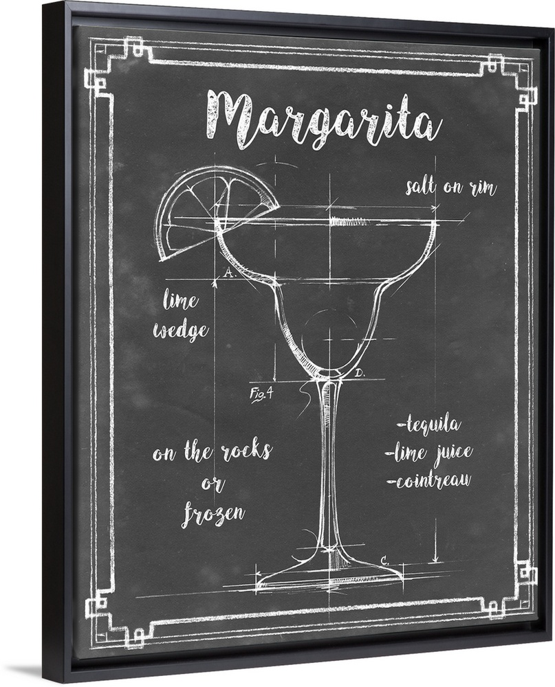 <p>Blueprint style diagram and recipe of a Margarita cocktail.</p>