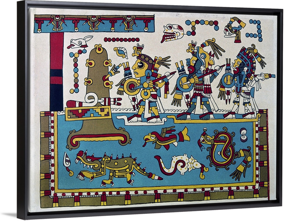 <p>Three canoe-borne warriors (Eight Deer at center) cross a lake to attack an island. Sea monsters swim in the water below them. Detail from the Codex Zouche-Nutall, c1450.</p>