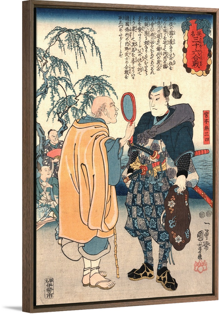 <p>Utagawa, Kuniyoshi, 1798-1861. Date Created/Published: between 1847 and 1850. Color woodcut print; 36.7 x 24.3 cm. Man holding up a magnifying glass to look at the famous samurai swordsman Miyamoto Musashi. From the series: Eimei sanjurokukassen : Thirty-six famous battles.</p>