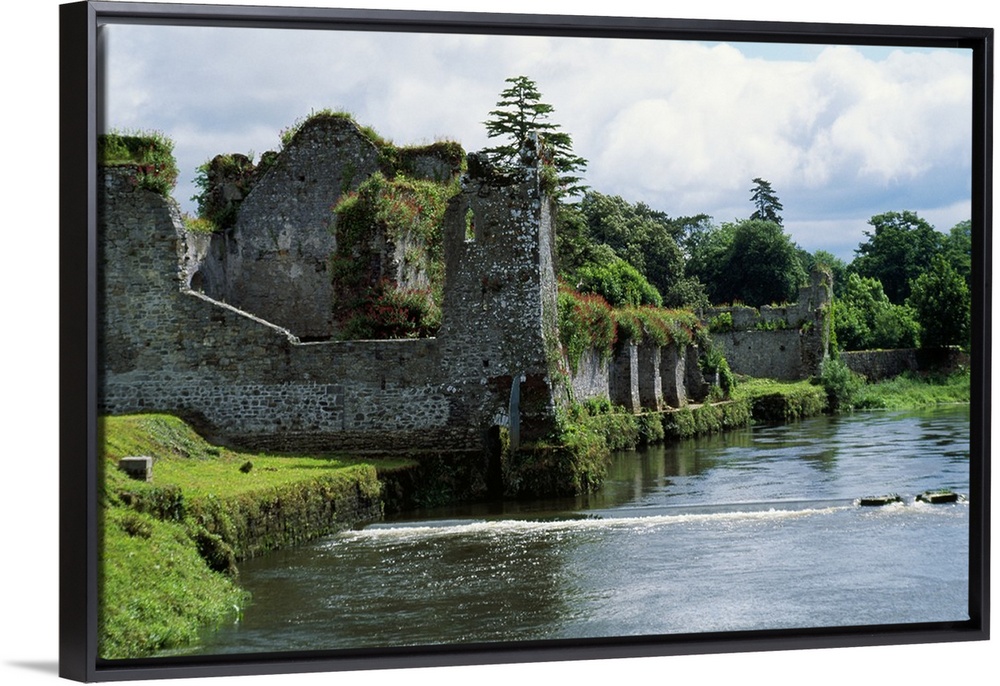 <p>Photograph of grass covered stone castle ruins in Ireland with a moat surrounding the castle walls.</p>