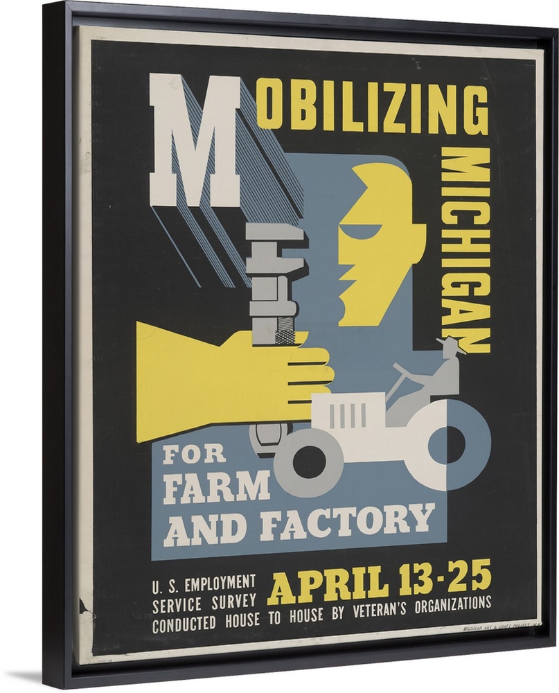 <p>Artwork announcing employment opportunities for farm and industrial laborers in Michigan, showing a hand holding a wrench and a man on a tractor.</p>
