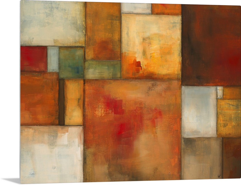 <p>Contemporary painting of squares and rectangles of different sizes and colors positioned together to make one rectangle.</p>