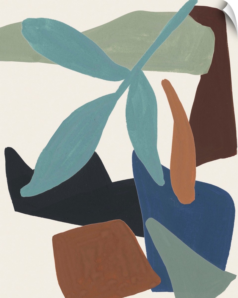 <p>Contemporary abstract collage of flowers, leaves, shapes, and vases in earth tones and blue.</p>