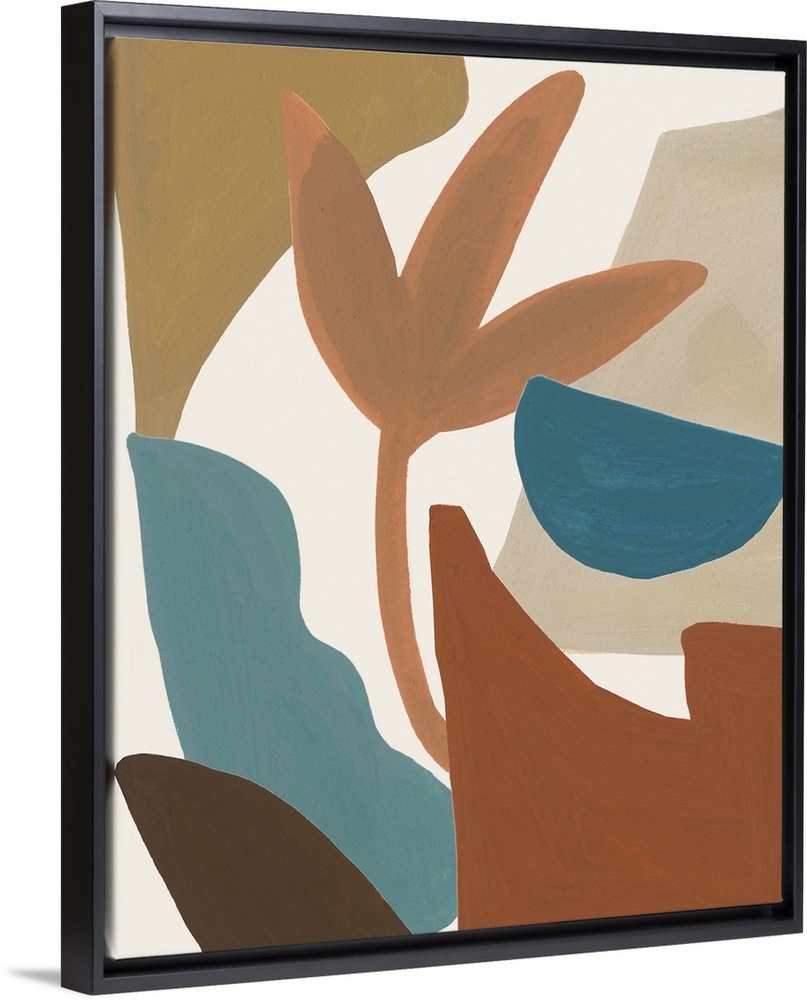 <p>Contemporary abstract collage of flowers, leaves, shapes, and vases in earth tones and blue.</p>