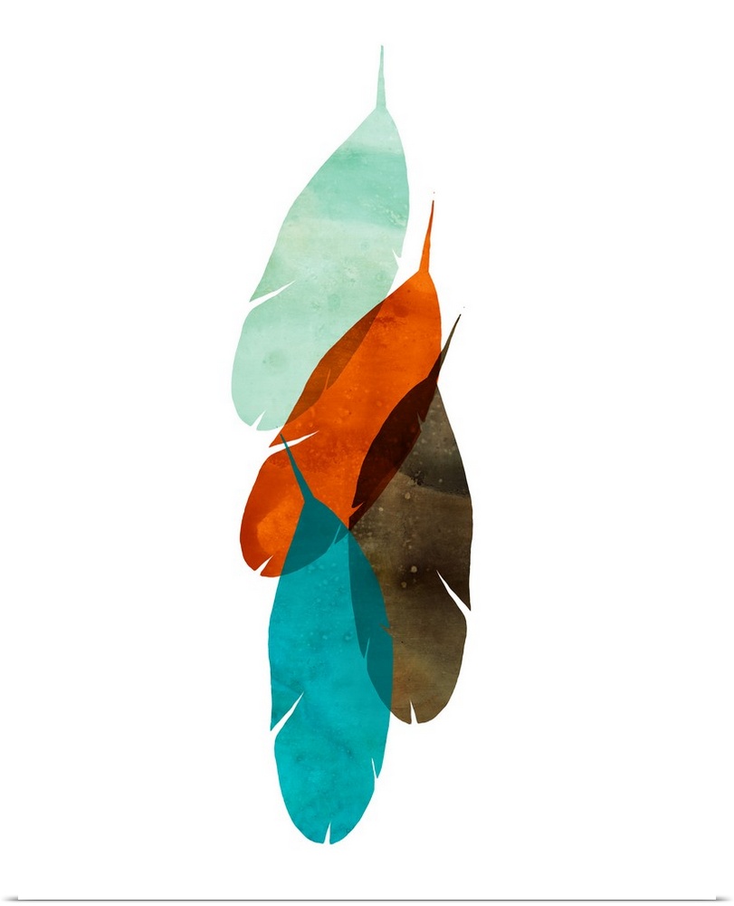 <p>Retro style watercolor painting of feather shapes in blues and oranges.</p>