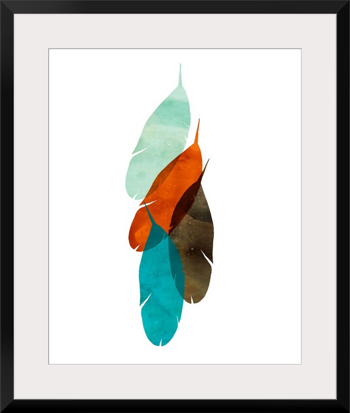 <p>Retro style watercolor painting of feather shapes in blues and oranges.</p>