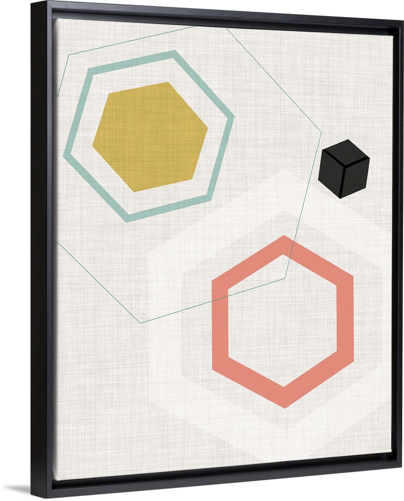 <p>Contemporary artwork of geometric shapes in muted colors against a burlap textured background in a retro mid-century style.</p>